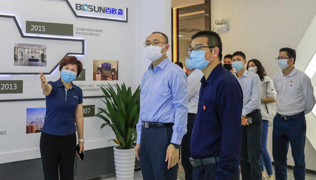 張書記一行來到深圳市百歐森環(huán)保科技股份有限公司,調(diào)研企業(yè)疫情防控和復(fù)工復(fù)產(chǎn)情況,在百歐森董事長(zhǎng)鄔婭玲女士的陪同下,對(duì)百歐森的尖端殺菌消毒凈化技術(shù)、企業(yè)智能化自動(dòng)生產(chǎn)流程以及全球市場(chǎng)業(yè)務(wù)模塊和銷售情況進(jìn)行了解。